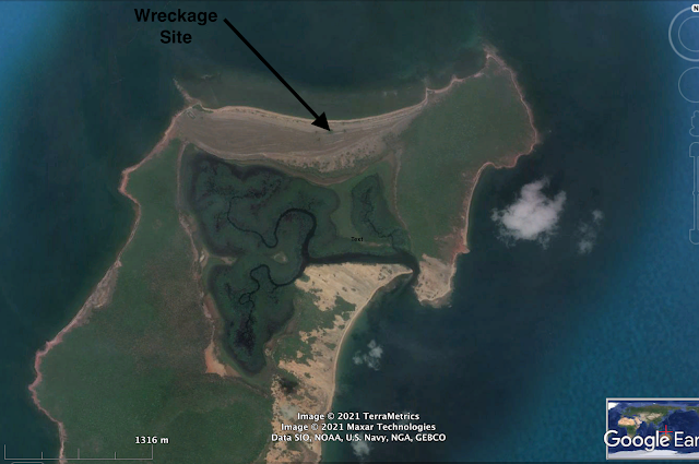 The boat access to this part of Croker Island is complicated by a reef protecting the beach. The drone photo below shows the reef exposed at low tide. The larger clump of trees near the beach just right of centre is where the wreckage is located.