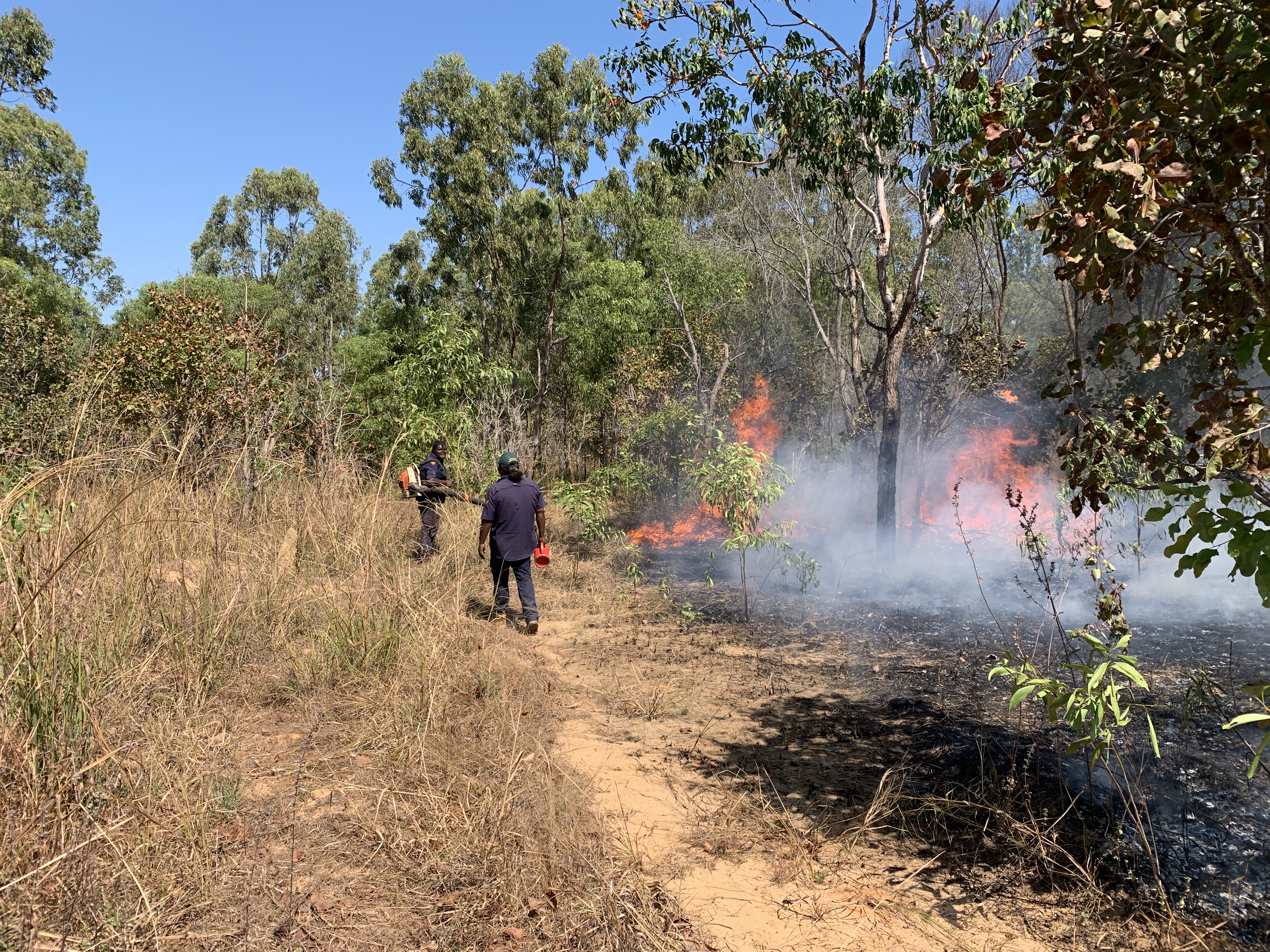 Below the rangers are conducting some asset protection burning around an outstation. A line of fire is set using a drip torch which uses a mix of petrol and diesel.
